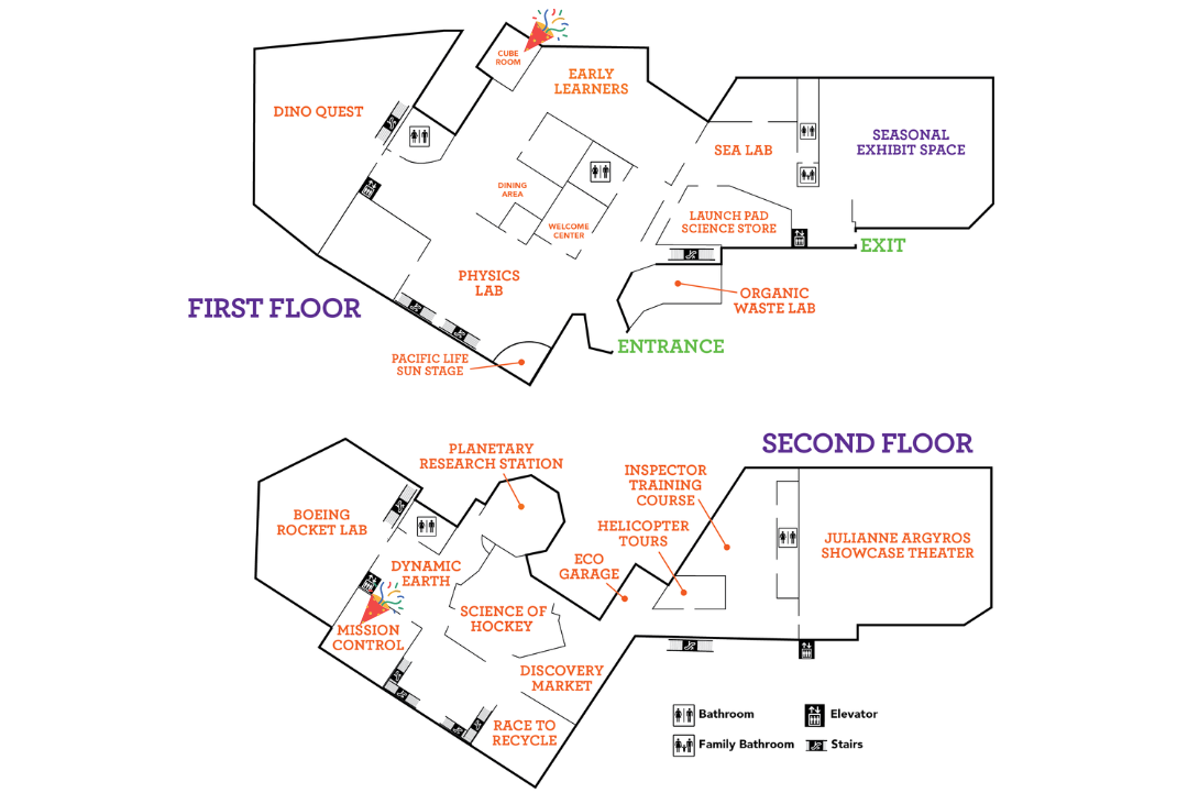Discovery Cube OC has two private party rooms available to book. The Cube Room is located on the first floor near the dining area and has a capacity of 46. Mission Control is located on the second floor near the Artemis Adventures exhibit and has a capacity of 50. There is an elevator nearby.